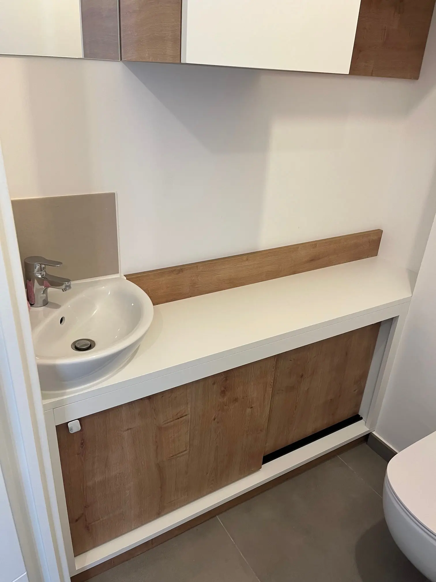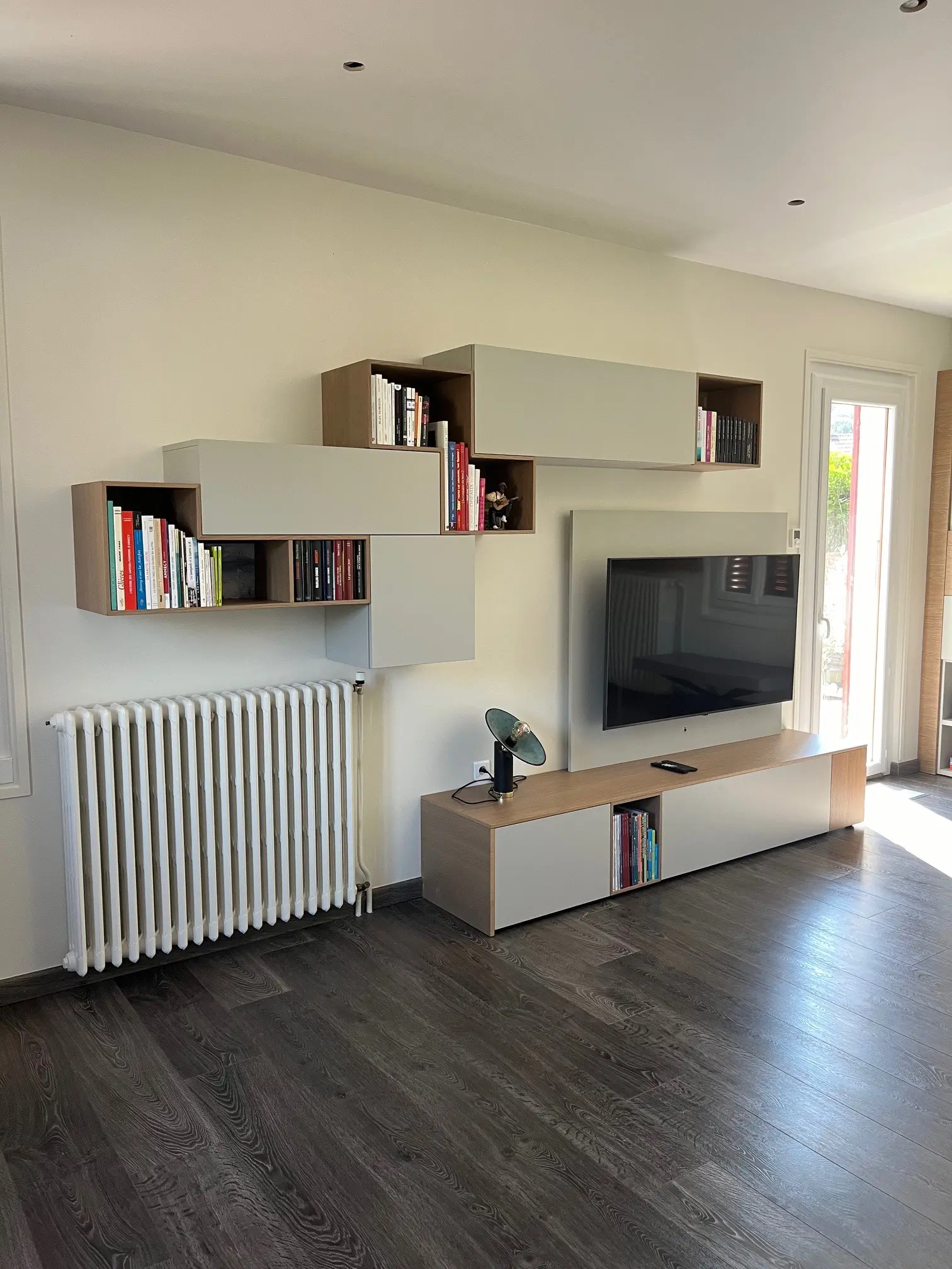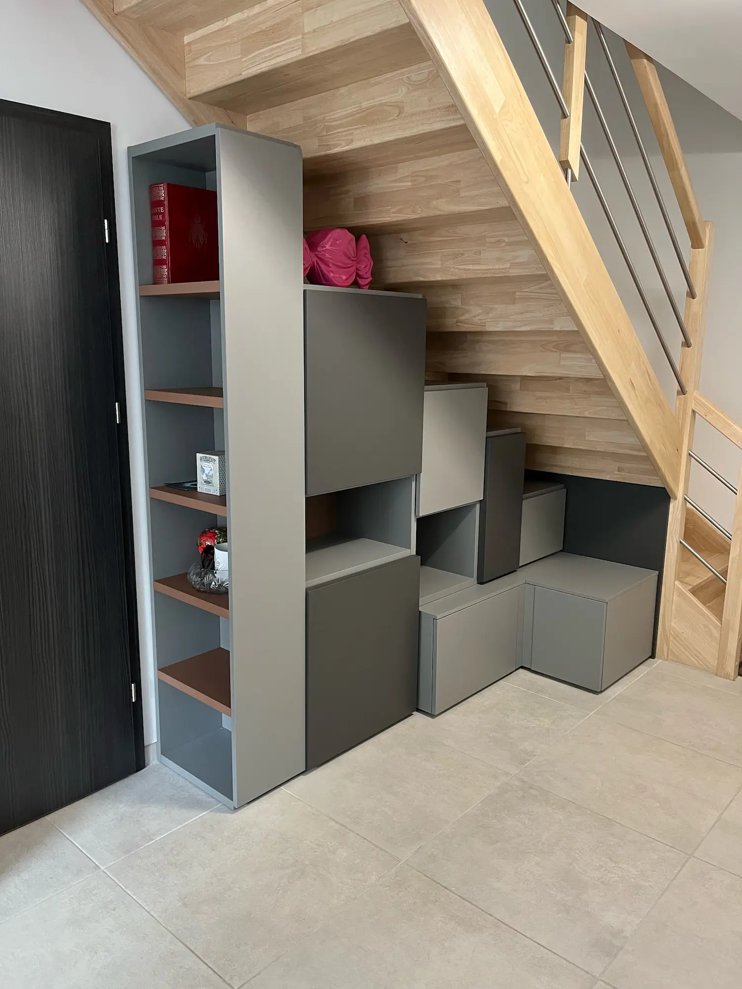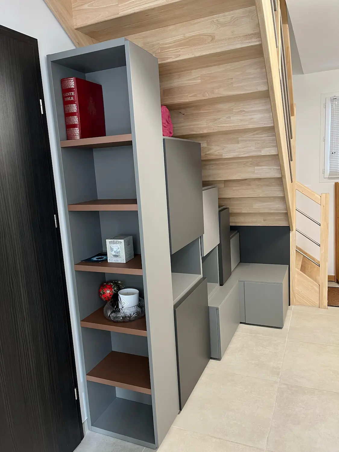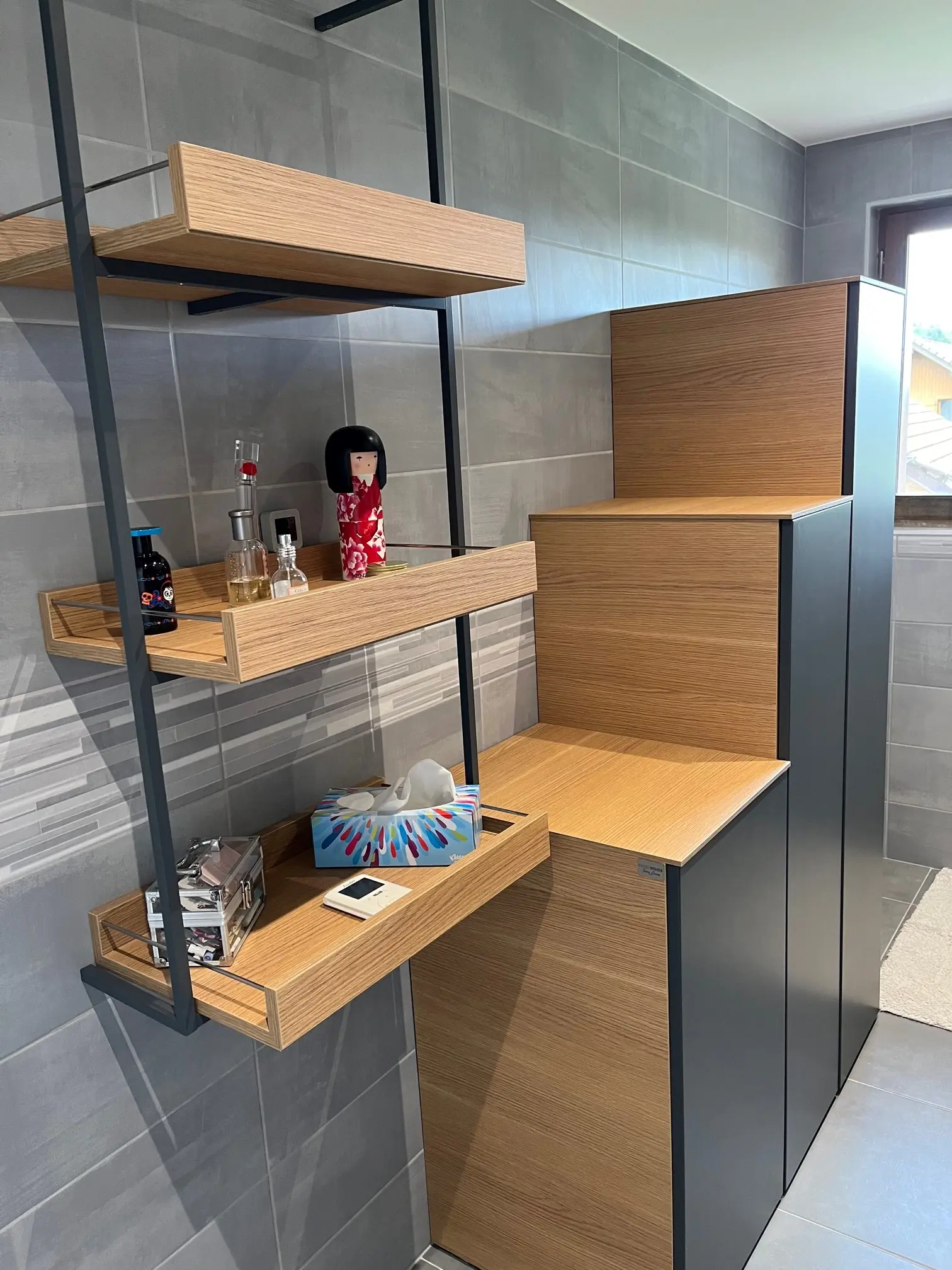 Claustra décoratifs, bibliothèques intégrées, meubles vasque ou consoles d’entrée : chaque création devient un élément architectural à part entière, pensé en harmonie avec l’ensemble de votre projet.