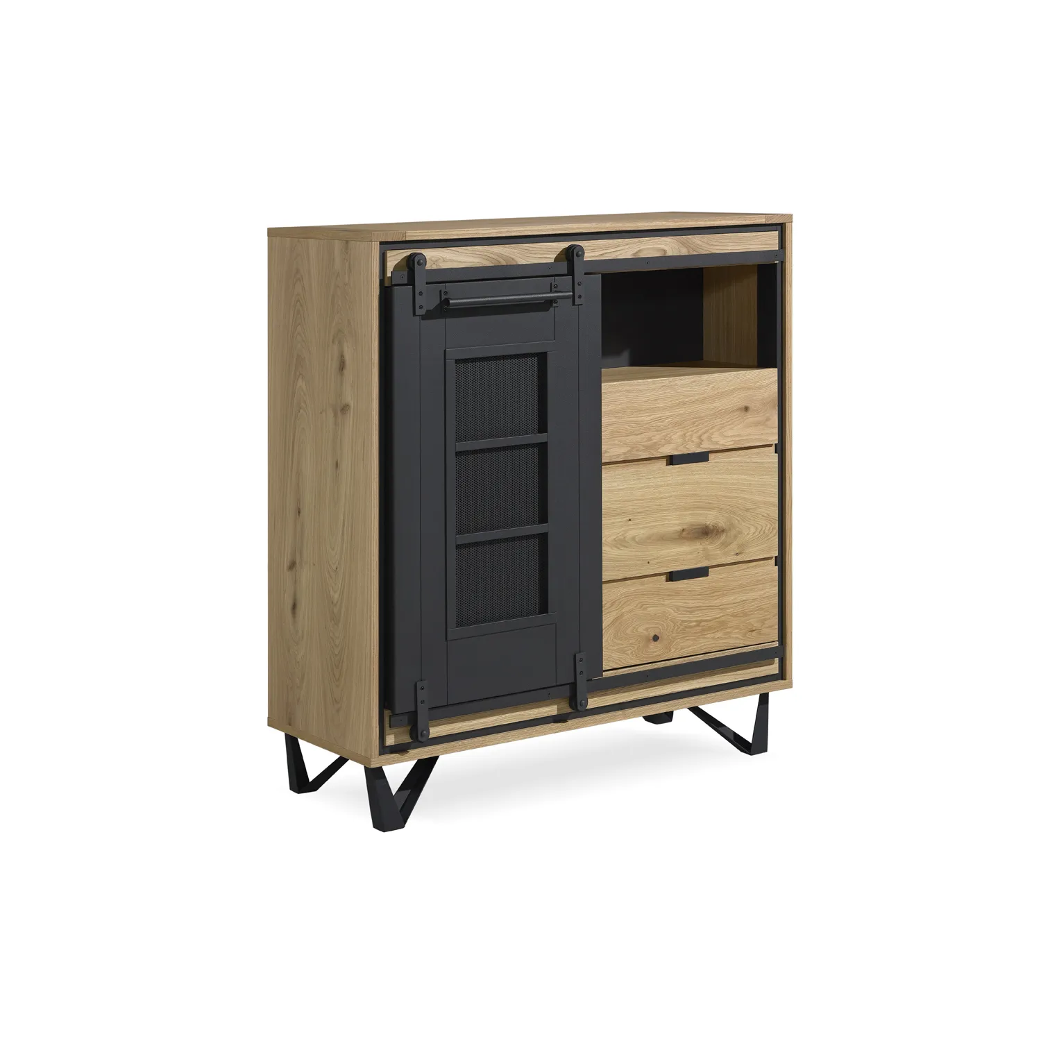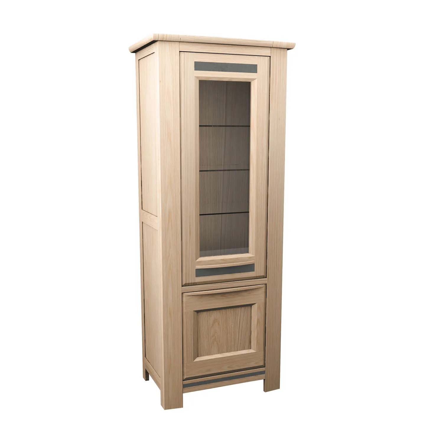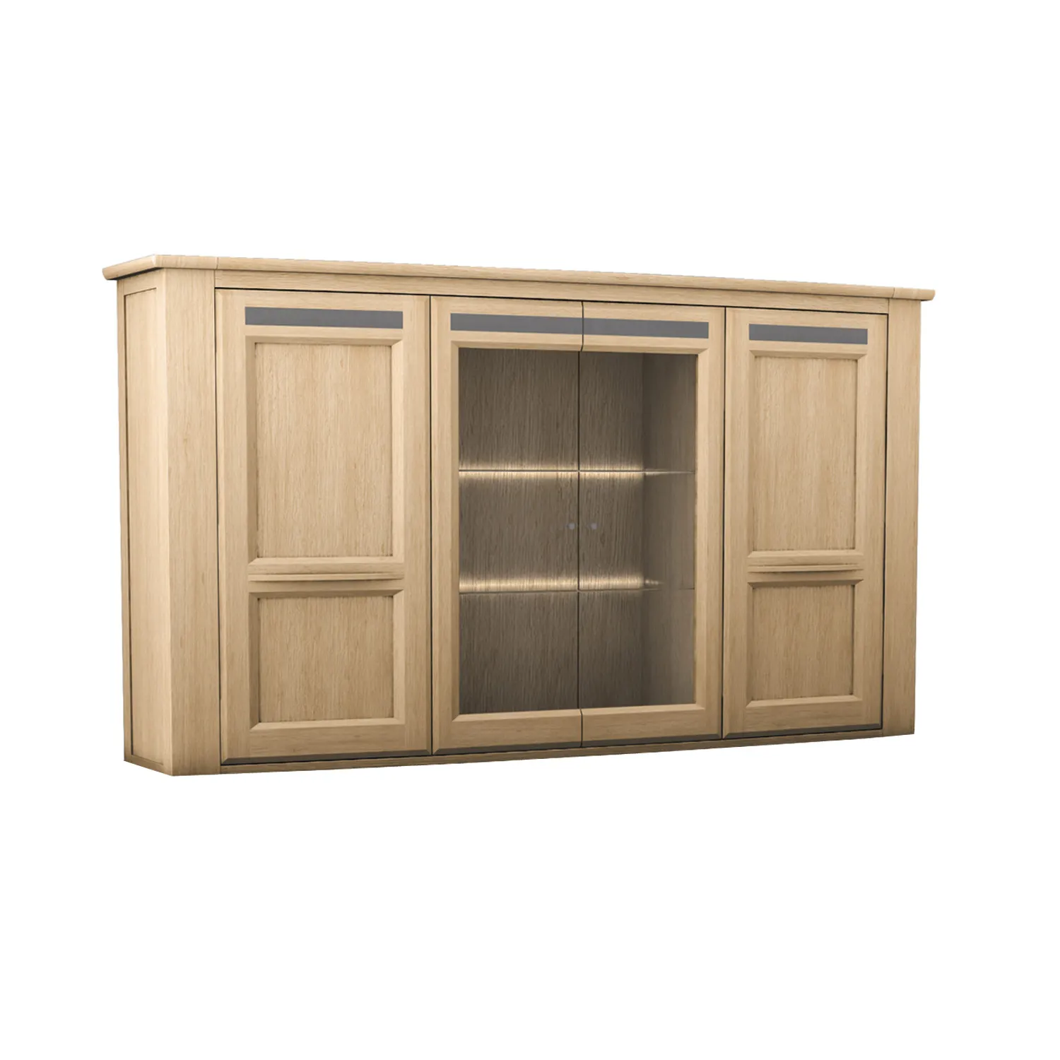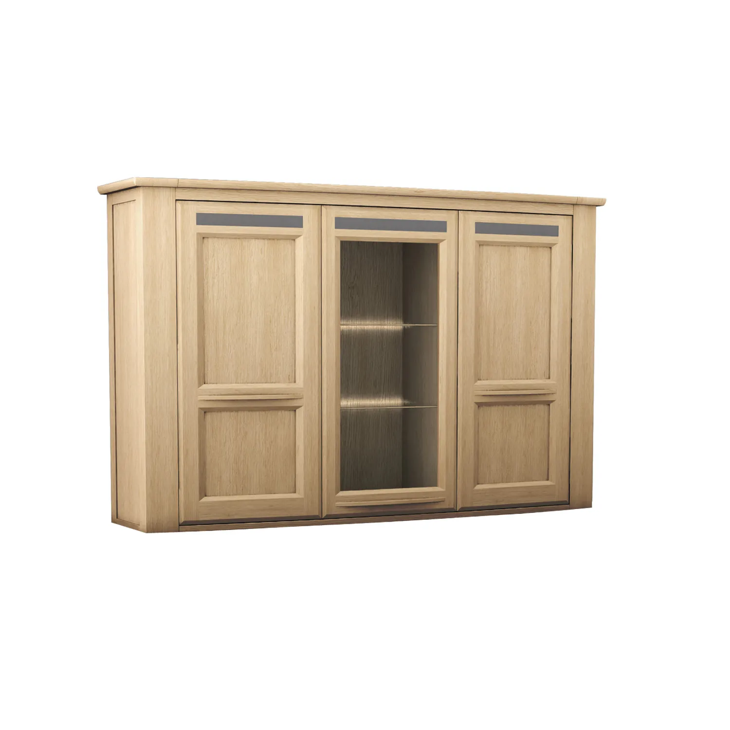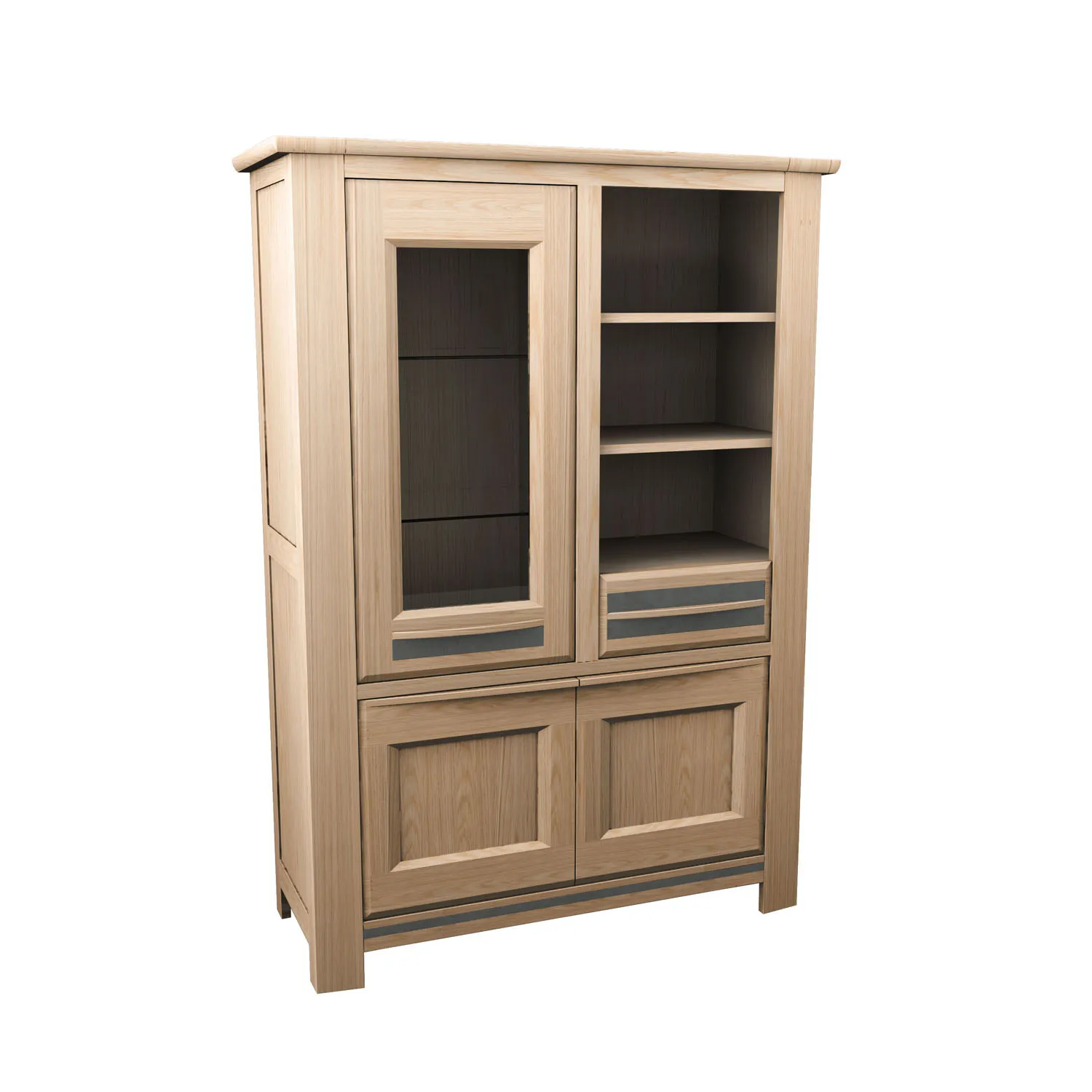Portes : Panneaux de fibres moyenne densité revêtus de placage chêne avec poignée incrustée grise en chêne massif.