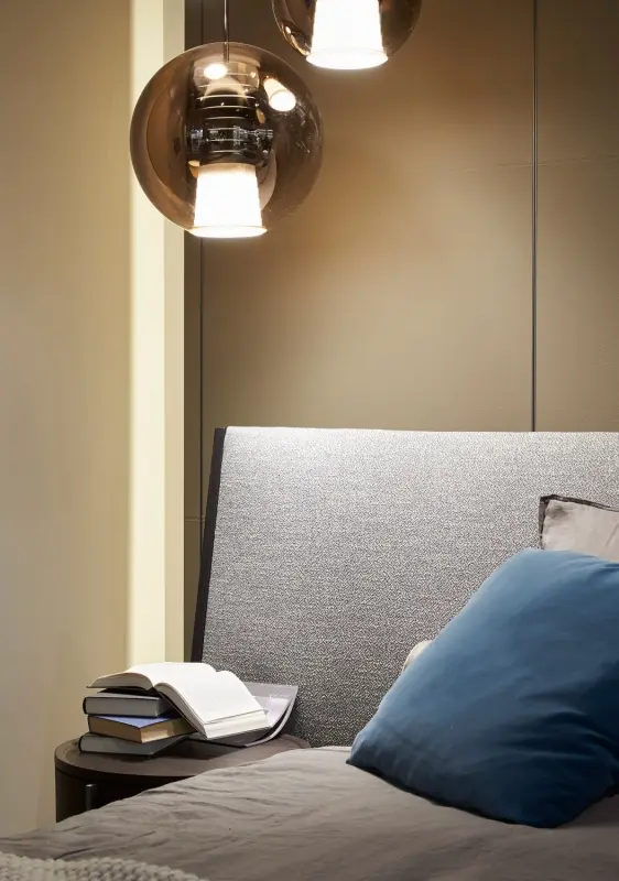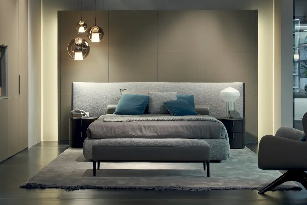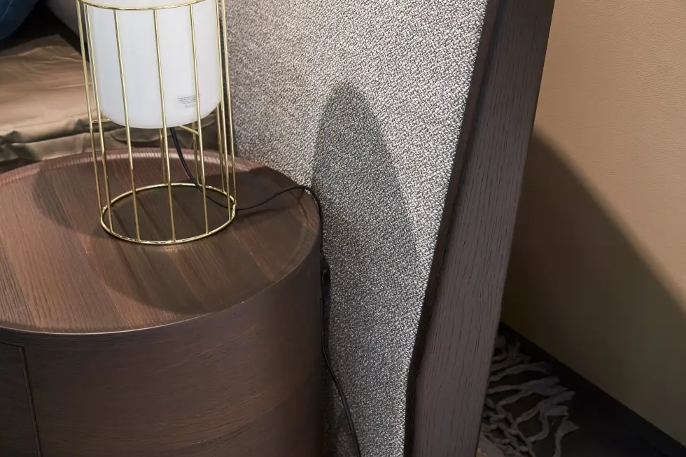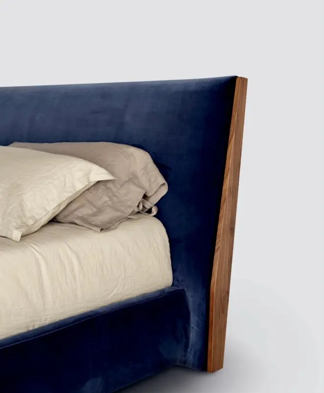 Le raffinement du bois habilement conçu pour encadrer les volumes. Une grande tête de lit avec des « ailes » embrasse des moments de détente, associées à une base textile douce et raffinée.