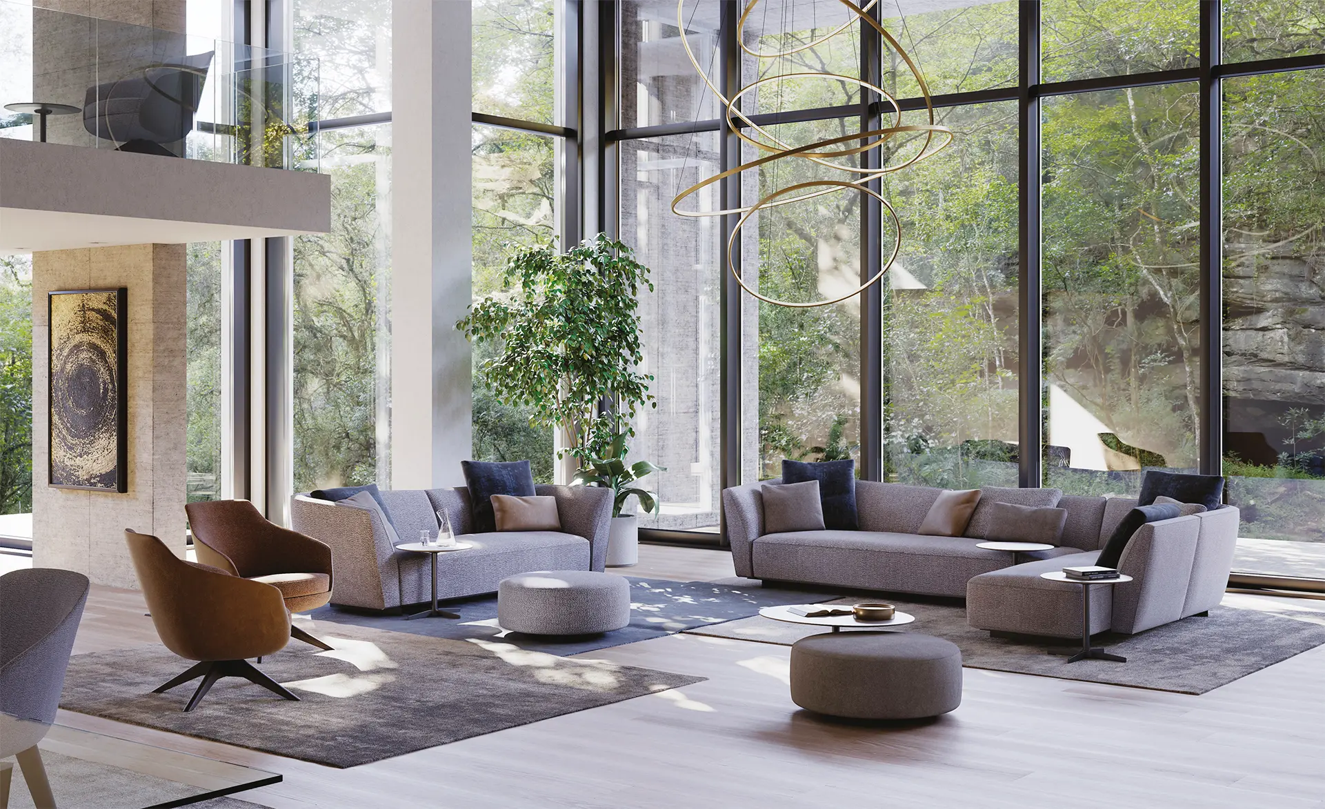 Créant un effet fascinant de légèreté et de suspension. Les connexions structurelles, volontairement cachées, exaltent la pureté des formes et la qualité sartoriale des finitions.